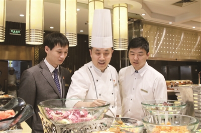 食品质量是餐饮的生命线。在日常繁杂的厨房工作中,孙寅钢坚持严于标准、追求完美,他的“较真儿”在餐饮部是出了名的。无论是盘形的选样、食材的选用、原料的配比、制作的工艺、出品的呈现,还是酒会、自助的摆台设计、灯光控制、菜品搭配等,他都亲力亲为、严格要求。“业精于勤,荒于嬉,要时刻保持严谨的工作态度,认真对待每一个工作环节,把每一份产品都当作是精品。厨师应有作品意识,不能机械式操作。”孙寅钢时常告诫厨师长们。