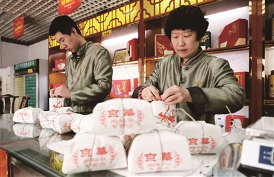 很多顾客就喜爱这老北京的纸包、绳捆的包装,这种包装的散装茶叶很畅销。包装造型完全靠手工,李莉这么一折、一捆,也就七八秒钟的时间,方方正正的茶包就包好了,一个大红色的“茶”字显示在茶包的正前方。包茶包要用巧劲儿,力气大了茶叶就碎了,不用力气就包不紧。吕宝琦说,他跟师父学了一年,才把这茶包包得像样了。而手抓茶叶,轻重也凭经验,李莉可是有“女版张秉贵”的称号。