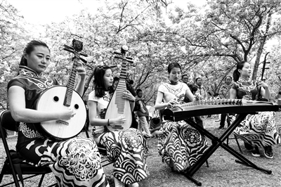 4月,玉渊潭公园晚樱林下,一组欢快的民乐演奏曲目拉开了园内晚樱盛开的序幕。时下,玉渊潭公园内上千株早樱已褪去繁华、吐露嫩叶。随着早樱花落、中樱怒放,园内的晚樱已进入最佳观赏期。据了解,玉渊潭公园所栽植晚樱品种主要有郁金、关山、普贤象、一叶等,数量近千株。本报记者 邱勇 摄影报道