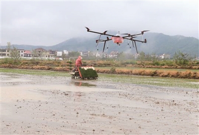 4月10日,100余名种粮户代表在江西省都昌县蔡岭镇国家种粮示范基地观摩农机插秧和无人机喷洒农药。当日,都昌县农机局开展春季送科技下乡活动,教会农民使用农机插秧和用无人机喷药,受到在场观摩代表高度评价。