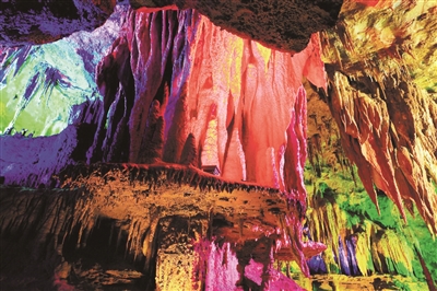 沿修葺的石道,抬头看上方,在七彩灯的映照下,岩石有了冷暖之分,大片的橙色、红色与蓝色、绿色交映,把这里映衬得瑰丽多姿,摇曳生辉。洞内陡升的都是祥瑞之气,把心底的一点点胆怯消弭得无影无踪。不由得轻轻抚摸身边的栏杆、石笋、石钟乳,栩栩如生的造型,让本来冰凉的固体,似乎有了体温,是带有远古历史的体温,是带有深厚文化的体温。