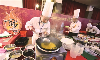 杏香鲤鱼海大虾、五行食蔬瑶玉柱、糟香提白牛肉、太极白玉发财羹……4月15日,2017年京台厨艺交流赛在高雄举行,来自京台两地的14位厨师同场竞技,切磋厨艺。据悉,此次交流赛由北京市总工会与台湾餐饮产业工会共同主办,两岸各派出7位厨师,分成热菜、冷拼、面点三组进行比赛。