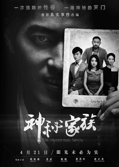 根据曾经轰动全国的“福建灭门”真实案件改编,由林依晨、姜武、陈晓、惠英红、蓝正龙等主演的悬疑惊悚电影《神秘家族》即将于4月21日公映。该片讲述了苗苗(林依晨饰)一家本来有着平静的生活,谁知在平安夜,家族的温馨聚餐却成为最后的晚餐。整个家族惨遭灭门,只有少女苗苗一人幸存。当她寻找惨案真相时,却发现家族中的每个人都在极力隐藏一个巨大的秘密,父亲(姜武饰)、母亲(惠英红饰)、弟弟(陈晓饰)之间的关系愈发扑朔迷离,而这一切都要从几个月前苗苗被神秘男子性侵的那个雨夜说起……
