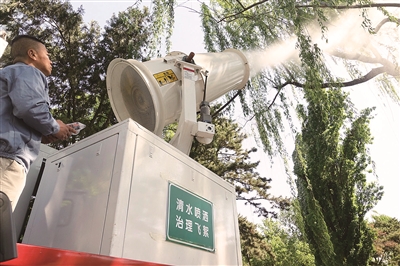 昨天,记者从北京市公园管理中心获悉,市公园管理中心已制定出台《杨柳飞絮治理整体实施方案》。年内,市属11家公园内6306株杨柳树逐一建档,将统一杨柳树编号并悬挂牌示,对市属公园有机融合疏枝修剪、花期喷水降絮、高位嫁接、注射药物及疏伐更新等手段,按照“因园施策 一树一档 一树一策”精准治理飞絮。图为昨天上午,北京动物园工作人员利用高压水炮车喷雾,把柳絮打湿不飞絮。