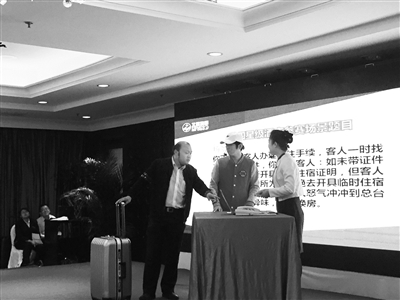 比赛题目就是日常工作的情景,其中包含突发事件和怎样处理客人的投诉,选手现场抽取参赛场景题目。集团7家酒店共14名职工参与了比赛。“一名单独工作的白班收银员,遇到客人到前台投诉,正在处理时,另一位来酒店参加会议的客人声称快迟到了,要求先办理入住。”这是国家会议中心的魏芳洁抽到的场景题目。