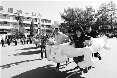 活动现场,最吸引眼球的莫过于龟兔赛跑的项目,5名选手穿上龟兔道具后站在起跑线上,6支队伍同时起跑,只见大家喊着统一的口号,共同前进,冲向40米外的终点。现场只见比赛队伍或默契配合、快速疾走,或状况百出、摔成一团,场面一片欢乐,引得现场笑声、掌声、欢呼声不绝于耳。
