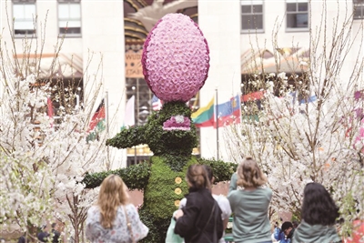 近日,美国纽约,洛克菲勒中心香奈儿公园为迎接复活节制作了一只用常春藤与苔藓修剪成的“复活节兔子”,头顶一只雏菊编成的彩蛋逗趣十足,引民众拍照。