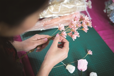 “今年北京的花开得多好啊!一下子激发了我的灵感。”门晓声笑着说。于是,她立刻买来相关花材,准备创作一个能够展现春天气息的花艺作品——留住春天足迹。对她来说,与花为伴,四季皆春。