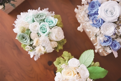 虽然鲜花很美丽,完成的作品也常常是充满了生命的力量、生机盎然,但是时间短是鲜花作品的致命伤。看到自己精心创作的花艺作品慢慢凋零,门晓声难免有些舍不得。于是,她将目光聚焦在了“永生花”上。“永生花是这两年才在国内流行起来的,也叫保鲜花、生态花,国外又叫‘永不凋谢的鲜花’。它是鲜切花经过一系列复杂工序加工而成的。无论是色泽、形状、手感,永生花几乎都与鲜花无异,而且保存时间长,至少3年。正好是做花艺设计的理想花材。”门晓声说。