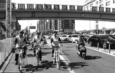 据了解,通州区15个乡镇、街道总工会已组建了30支“红旗,绿车,黄马甲”交通文明骑行示范宣传队,每队十人,从4月14日起,就多次出现在通州区各乡镇、街道的主要道路上。按照统一部署,从即日起每周二、四上午7点半至8点半,30支交通文明骑行示范宣传队将分别在各自规定的固定路线上骑行一小时,引导通州所有骑车人文明骑行,让“我知晓,我参与,十万职工共创城”活动在通州开花结果。李一然 摄