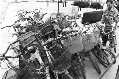 日前,朝阳区吉庆里社区开展的“清净家园、清理僵尸自行车行动”清理了近300辆废旧自行车,“僵尸车”将统一运走存放。清理后,小区里腾出的地方可以给居民提供更多活动空间,楼道里上下通行将更加方便。本报记者 孙妍摄影报道