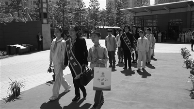 参加活动的劳模、首都劳动奖章获得者身披绶带,在中关村第三小学的学生护行下走上红地毯,师德先锋代表、“京教杯”一等奖教师代表为劳模送上鲜花表达祝福。