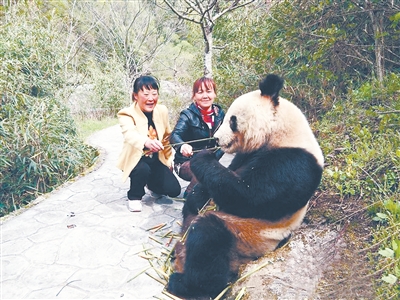 4月21日上午8时30分左右,陕西洋县华阳景区保安陈宝忠正在龙吟峡巡查。在距离长青国家级自然保护区道口约0.5公里远的步道旁猛然看见一个黑白身影——一只野生大熊猫正在慢慢悠悠散步。“我和景区的保洁赶紧在附近采集了一些竹笋,拿过去喂它。它接过竹笋就吃了起来。”陈宝忠说,过了约20分钟,第一批游客上来后,都来围观这只大熊猫,和它合影。这只大熊猫也一点“不认生”,对合影来者不拒。