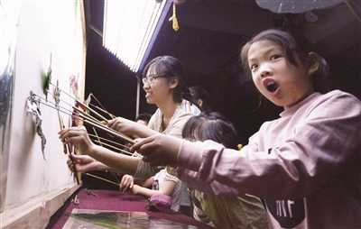 | 在老舍茶馆举行的“品大碗茶 赏传统戏”传统民间艺术沙龙活动,许多家长和孩子们应邀上台体验皮影戏表演。 |