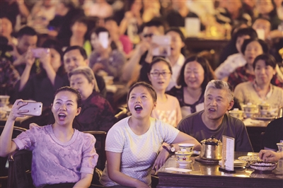 | 老舍茶馆传统民间表演引来了现场150名观众阵阵叫好和掌声。 |