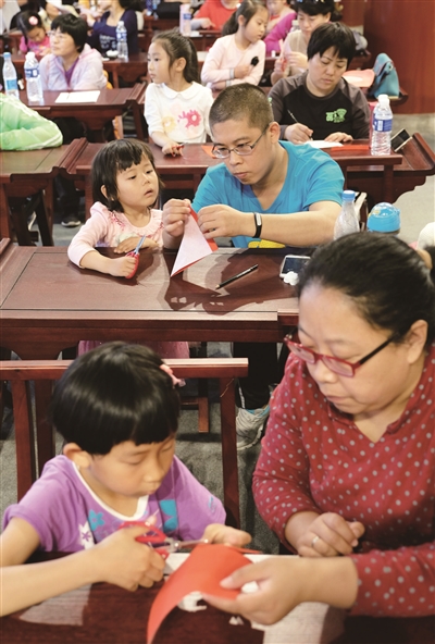 | ▲百余家庭来到劳动人民文化宫参加“小手拉大手”剪纸手工体验亲子活动。在老师的指导下孩子们剪出了人生第一张剪纸作品。 |