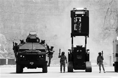 第九届“勇士竞赛”国际特种兵比武4月30日在约旦首都安曼近郊的阿卜杜拉国王特战训练中心拉开帷幕。此次共有来自17个国家的32支队伍参赛,他们将在为期5天的时间里就多个项目展开角逐。图为在约旦首都安曼近郊,约旦特种部队在开幕式上展示反恐突击等训练成果。 新华社发