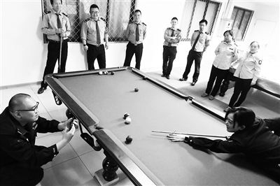 “别动,抬下头。”如果不说,您肯定看不出这是比赛现场。昨天,公交电车公司七队工会联合北京市公安局公交安保分局东直门站派出所、公联枢纽公司东直门交通枢纽站举办“三公”台球赛,三家单位的台球高手在工作之余聚到一起,切磋球技。比赛氛围轻松愉快,职工们打球中还不忘给队友拍照。