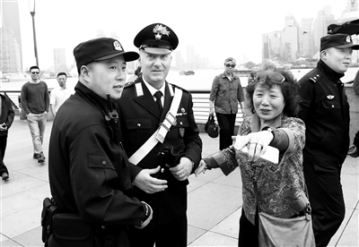 5月2日,中意联合警务巡逻第二站在上海举行。来自意大利的4名警员分两组与上海公安民警在浦东陆家嘴、外滩、豫园等地进行混编徒步巡逻,并现场观摩上海民警接处110警情、管理街面治安、开展街面盘查等工作。 新华社发