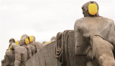 当地时间4月26日,巴西圣保罗,在第22个国际噪音意识日到来之际,当地民众为一处纪念碑的雕像戴上黄色的隔音耳罩。