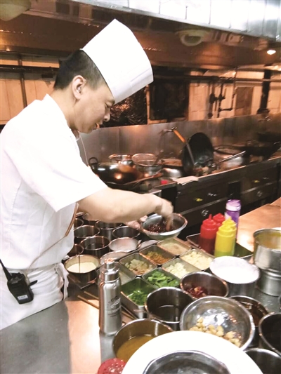 虽然店里采取了一系列通风措施,但是中午的厨房,还是比较热的。在厨房待得时间长了,曲海波依然会满头大汗,只见他边擦汗边笑着说:“让顾客吃得开心,我们再辛苦也是值得的。”