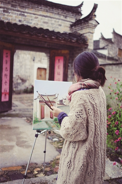 清早,在鸟鸣声里自然醒来,出门闲逛,比你早起的是散落各处的画家们,走几步就能遇上一两个,这才明白“画家村”实是不虚,到处是写生的美院学生、老师或画家,油画、水墨、水粉,各种流派都有,支一块画板,孜孜不倦地画。村前的一所祠堂里,就陈列了许多作品。细细看,无论是抽象的,写实的,泼墨的,线描的,真有不少好作品。那些你去过的,或即将去看的建筑无论桥与塔,民居或宗祠,梁柱雀替,远山粉墙,木雕砖雕,都在画上,你随便一站,就成了画上的人,想想挺有意思。