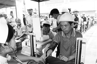 义诊现场,先锋志愿者服务队为医务人员和农民工兄弟们搭设了临时体检帐篷,并准备了饮用水和清凉饮品供参检人员饮用。医务人员为农民工兄弟量体温、测血压、脉搏,进行内科听诊、外科诊断及医疗咨询服务,并为农民工们建立健康档案,制订健康调理计划。对现场不能确诊的情况,医务人员细心叮嘱农民工要前往医院做细致检查。
