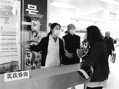 医改实施后的第二个工作日,海淀医院继续安排职能科室工作人员在门诊各层为患者进行服务。此外,为了方便病人就诊,了解医改政策,除门诊服务中心外,医院还于当日在门诊二层收费处旁增设“医改咨询”台,并增派2名工作人员,为患者答疑解惑。“这期间,患者咨询的最多的还是,医事服务费是什么、医改后报销比例有没有改变等问题。”张福春说。