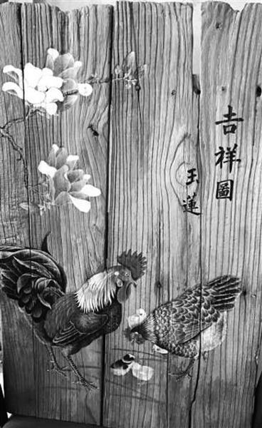 从此,莲大姐开始研究木板画。她发现越是陈旧、风化越厉害的木板儿,画上国画后,颜色越鲜艳,线条越流畅,视觉效果越强烈。她不知道是旧木板衬托了她的画,还是画儿让朽木有了生机。大家看后都赞同这种画的创意不错。