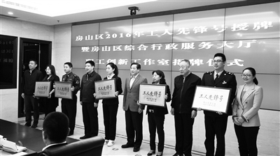 近日,房山区总工会、区投资促进局和区科委共同举办了房山区2016年工人先锋号授牌暨房山区综合行政服务大厅职工创新工作室揭牌仪式。据了解,2016年区总工会共评出20个“房山区工人先锋号”和11个“职工创新工作室”。本报实习记者 闫长禄 通讯员 刘永久 摄影报道