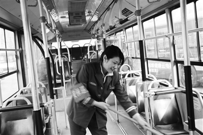 当我如约来到王丛会的接班地点和平里东桥下时,她早早就忙活开了,与早班司机谈论着车辆及路面的情况,认真地做着出车前的各项准备工作,敲轮胎、查机油、看仪表等。接着就开始搞车辆卫生。