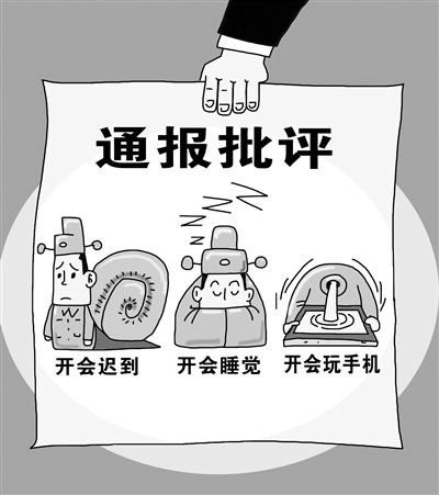 迟到、打瞌睡、玩手机、交头接耳……近日,在贵州省麻江县纪委会议室里,17名科级干部看到自己在开会时的违纪视频,个个哑口无言、面红耳赤、羞愧不已。(5月20日新华网)□朱慧卿