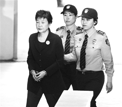 朴槿惠5月25日在首尔中央地方法院再次出庭,接受其有关涉嫌受贿、滥用职权等18项罪名的审理。图为韩国前总统朴槿惠(左)抵达首尔中央地方法院。新华社发