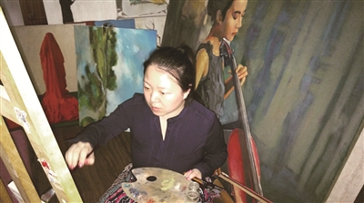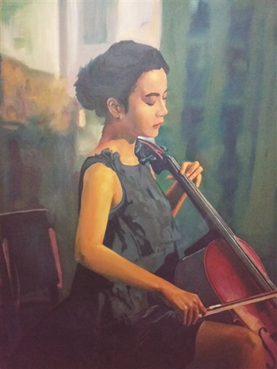 于杨杨最喜欢的一幅油画的名字叫《拉大提琴的女子》。那是一个20多岁的女子,在夕阳下,恬静、专注、投入地沉醉在大提琴的艺术世界里。从2015年开始画,她陆续画到了现在。