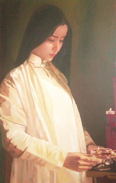 “当时夕阳将女子整个脸部都映衬成了金色,那柔和的鲜艳感,和枣红色的大提琴搭配在一起,营造了一种温和、宁静的氛围,后面是城市的高楼,还有高楼间一小片蔚蓝的天空……每次画这幅画,我都觉得很愉悦,在喧嚣的城市里,或许每个人都渴望寻求那一份内心的安宁吧!”于杨杨感慨地说。