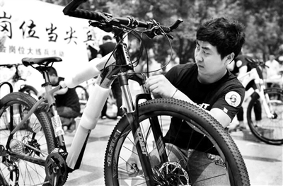 摆放、拼装、成型,不一会儿的功夫,地上的一堆零件,就变成一辆完整的自行车。近日,东城区交道口街道总工会与辖区企业捷安特自行车联合举办岗位练兵活动,经过几轮筛选,捷安特挑选出优秀职工参加最终比赛。本报记者 边磊 万玉藻 摄影报道