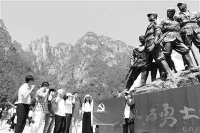 在狼牙山五勇士的雕塑前,该党支部成员宣读入党誓词。虽然当天气温在30多度,60多岁的老党员臧汝奇、孟宪鹏仍一边攀登狼牙山,一边鼓励年轻的党员。一个小时后,他们终于登上顶峰瞻仰“狼牙山五勇士纪念塔”。党员们又赶到易县梁格庄镇百泉村文化广场,登台与草根艺人一起演出。青年歌手周芷诺连唱几首歌曲得到了村民阵阵热烈掌声。反串演员付百灵则为村民奉献了河南豫剧、河北梆子选段。随后,该党支部又驱车来到梁格庄镇阳谷庄村慰问贫困村民,送上自费买来的米和油。