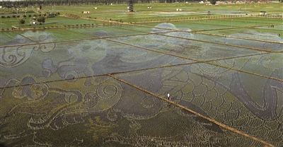 近日,在沈阳,总占地面积500余亩的《见龙在田》、《闻鸡起舞》等18幅巨幅“3D稻田画”亮相沈北新区。