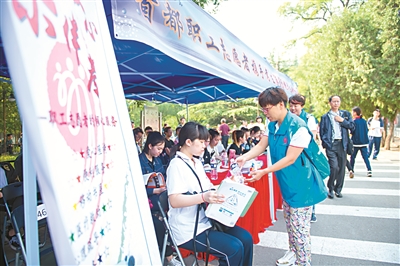 昨天,北京有6万余名考生走进考场。充电宝、小凉扇、爱心椅、清凉油、书报……在首都职工志愿服务队搭建的临时服务站点内,志愿者们给家长、考生以及保障服务高考的有关行业职工提供帮助和服务。今年是首都职工志愿者服务高考的第3年,服务站点增加到20个,服务内容也增加到21项。(相关报道详见第8版)本报记者 彭程 摄影报道