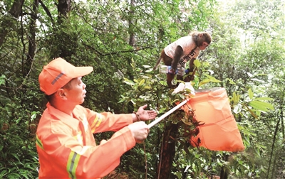 6月5日,正值世界环境日,湖南长沙石燕湖金龟岛上的工作人员与装扮成清洁工的猴子巡山捡垃圾,猴子将一些被随意丢弃的饮料瓶拾起放入垃圾袋,为自己的家园保洁。