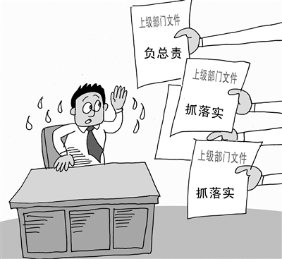 日前,记者在一些国企采访时了解到,有的企业有时一天能收到来自上级部门的二三十份文件,件件要求企业“一把手”对某项工作“负总责”“抓落实”。该企业负责人说,这二三十个文件有时看都看不完,何谈负总责和抓落实?上级文件太多,下级如何处理?对策之一,文件来了,改头换面直接下发;或收件者依样画葫芦,继续下发,击鼓传花。(6月12日新华社)□老笔