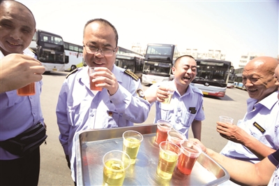 解暑的绿豆汤、爽口的酸梅汤、清香的茉莉花茶、冰镇矿泉水、防暑小药箱……昨天中午,正值雨后放晴,公交第三客运分公司第十三车队工会将清凉饮品送到一线,司售人员上岗前下岗后随时可以享用防暑降温饮品。