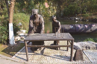 鲁迅故里位于绍兴老城的鲁迅中路,鲁迅原名周树人,周家本是绍兴望族,自鲁迅父亲起逐渐家道中落。三味书屋坐东朝西,光线黯淡,站久了,依稀看见头发花白的寿镜吾老先生一手执戒尺,一手捧书本,摇头晃脑地领读“秩秩斯干,幽幽南山”,两旁依次是学生课桌,南边靠墙的一张课桌面上有一个“早”字,少年鲁迅求学时迟到受先生责备而刻下时时提醒自己。“百草园”是孩童们淘气玩耍的天地,名为“百草”,其实里面种植着齐整的菜畦,夜半无人私语时,是否能听到油蛉低唱?亦或还有令人魂牵梦萦的花妖狐仙翩然而至?走出故居,站在故里正门口,看到一堵用白得耀眼的花岗岩砌成的巨大文化景墙上高大的鲁迅壁画,他双眉紧蹙、手握烟斗,似乎在沉思什么……