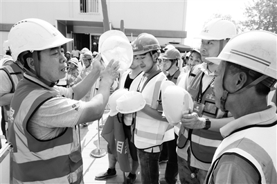 昨天,北京建工城市副中心项目部举行以“全面落实企业安全生产主体责任”为主题的安全咨询日活动。活动现场,在各分包单位安全员的见证下,对A2项目部成立的安防大队进行授旗;一线职工参加了安全知识问答,安全监察员还当场砸毁了不合格的安全帽并现场进行安全教育。
