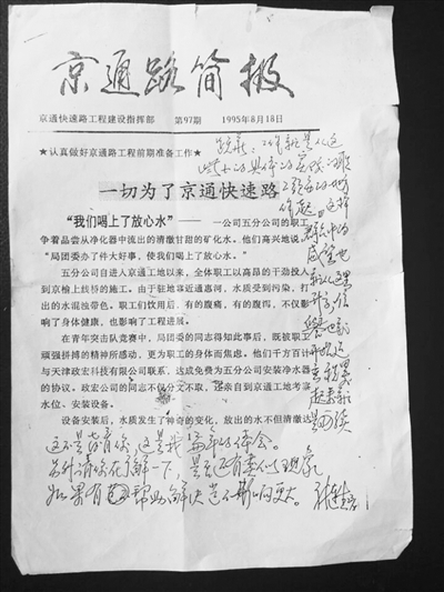 这份第97期的京通路简报以“一切为了京通快速路”为标题,“我们喝上了放心水”为副标题报道了这一事件,在施工沿线引起较大反响。但令我没想到的是,简报发出的第五天,时任市政工程局局长张连生就在这期简报上做了批示。“跃华:工作就是从这些小的、具体的、实际的职工需要的地方做起,在群众中的威望也就从这里升高,信誉也就开始建立积累起来。这不是教育你,这是我多年的体会。另外,请你再了解一下,是否还有类似现象。如果有帮助解决定会影响更大。”
