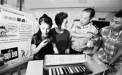昨天,石景山社区民警向居民讲解毒品对社会、家庭的危害。当日,石景山区举办了“拒绝毒品 健康生活”为主题的禁毒宣传活动。活动中,区禁毒委员会办公室拍摄制作的微电影《多肉》进行了首映,告诫群众毒品的危害,引导社区居民向毒品宣战。本报记者 陈艺 摄影报道