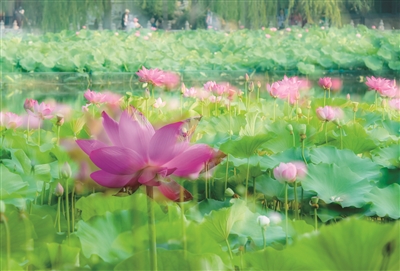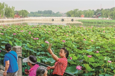 当下,正值荷花绽放的季节,颐和园、北海、陶然亭、紫竹园等公园的荷花竞相开放,呈现出“接天莲叶无穷碧,映日荷花别样红”的壮观景象。小荷露出尖尖角、荷花含苞待放、莲蓬逐渐成熟……荷的每一个生命周期都给人带来视觉的享受。在荷塘旁,三三两两的游客和摄影爱好者,用手机或相机记录眼前的美景。