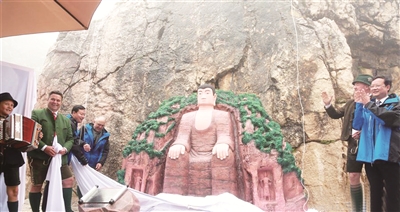 7月2日,在奥地利达赫施泰因山—萨尔茨卡默古特景区,来自中国四川乐山市的代表团成员与奥地利旅游部门工作人员共同为微缩版乐山大佛佛像揭幕。中国四川省乐山市2日向奥地利达赫施泰因山—萨尔茨卡默古特景区赠送一座微缩版乐山大佛佛像,并正式安放在景区内。
