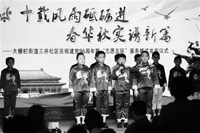 近日,大栅栏街道三井社区“十载风雨砥砺进 春华秋实谱新篇”暨“志愿五环”服务模式发布仪式在老舍茶馆拉开了序幕。三井社区的小学生通过自编的舞蹈、三句半、诗朗诵等文艺节目,向社区里的左邻右舍展示志愿服务的故事。本报记者 陈艺 摄影报道