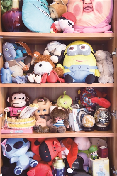 在赵芳的房间里,有个放着数十只玩偶的玻璃窗柜子,蛇、猴子、猪、史迪奇、屁桃,更多的则是叫不上品种和名字的怪诞造型玩偶。在储藏室里同样也摆放着一个装满玩偶的柜子,赵芳表示“这根本不算”,究竟有多少玩偶她自己也数不过来,“之前搬家时,我的玩偶一共装了10个左右的黑色大塑料袋。”